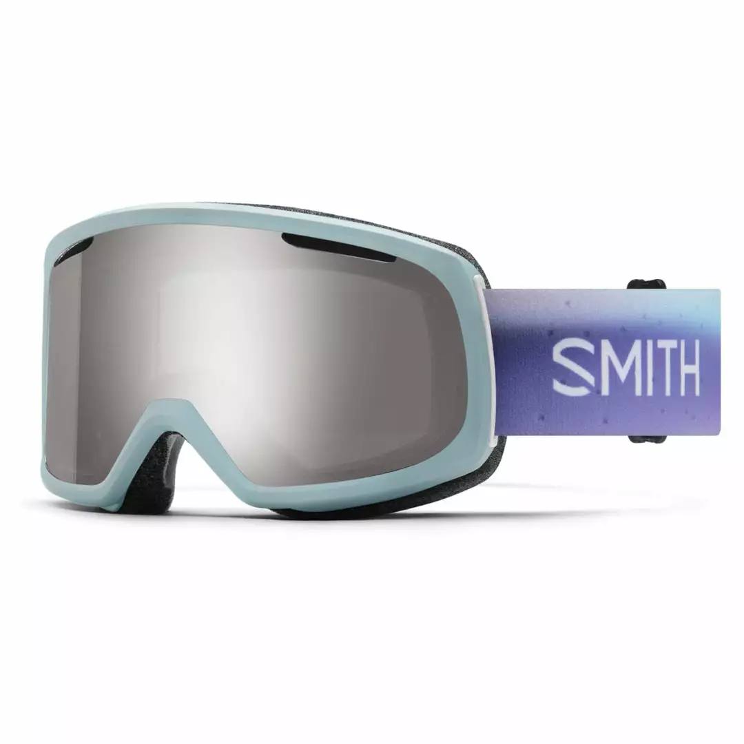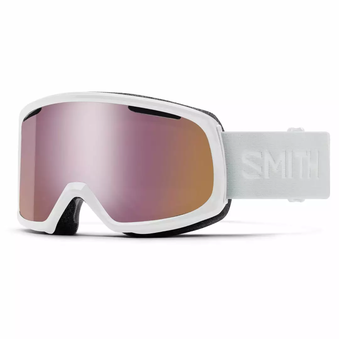 The Smith Riot goggles merge the wide-ranging view of an oversize cylindrical lens and minimalist frame with a medium fit for a woman’s face.