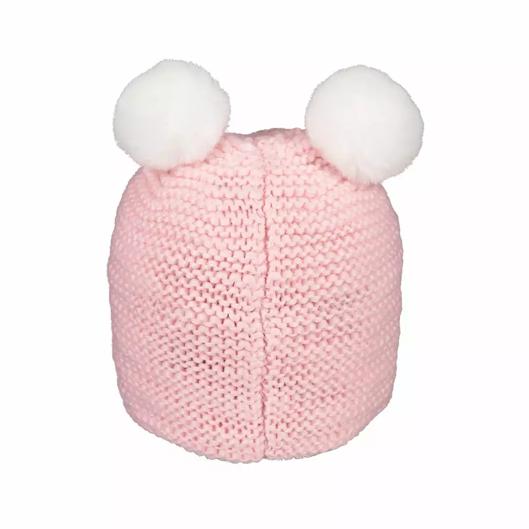 A dual pom-pom beanie. The gorgeous poms are a blend of 67% acrylic and 33% modacrylic dipped raccoon faux fur. Woven with a bulky 100% acrylic yarn the texture is divine and complements the elegant poms above. Fleece inner band. Fleece, Fur.