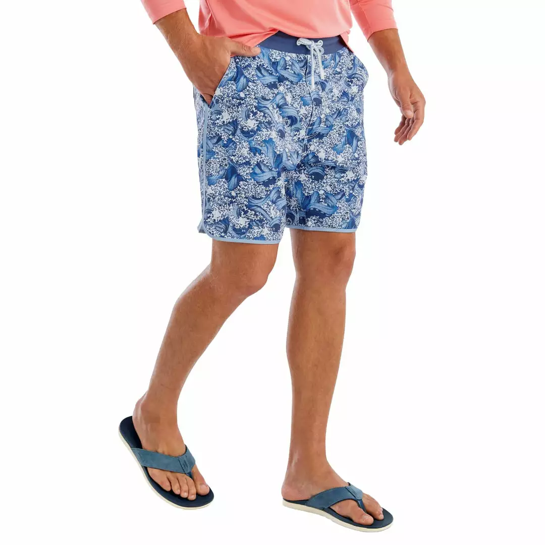 The Miyako surf swim shorts from Johnnie-O offer fun prints and pops of color, perfect for the boat, beach, or pool. Interior netting for added comfort. 7″ inseam.