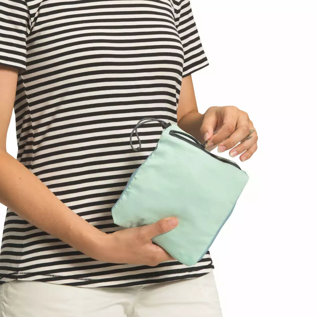 - Stows into back-left zip pocket to become an easy-to-carry wrist bag