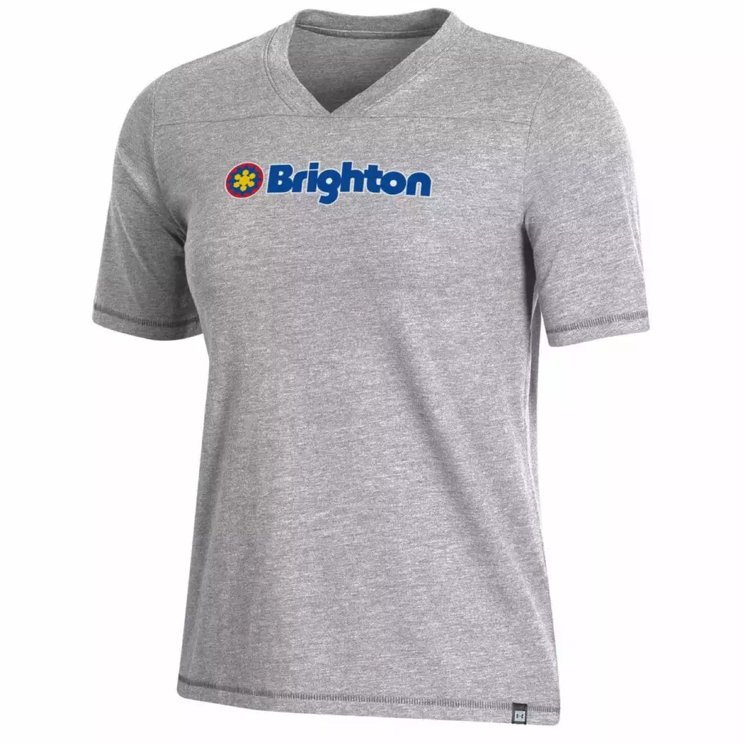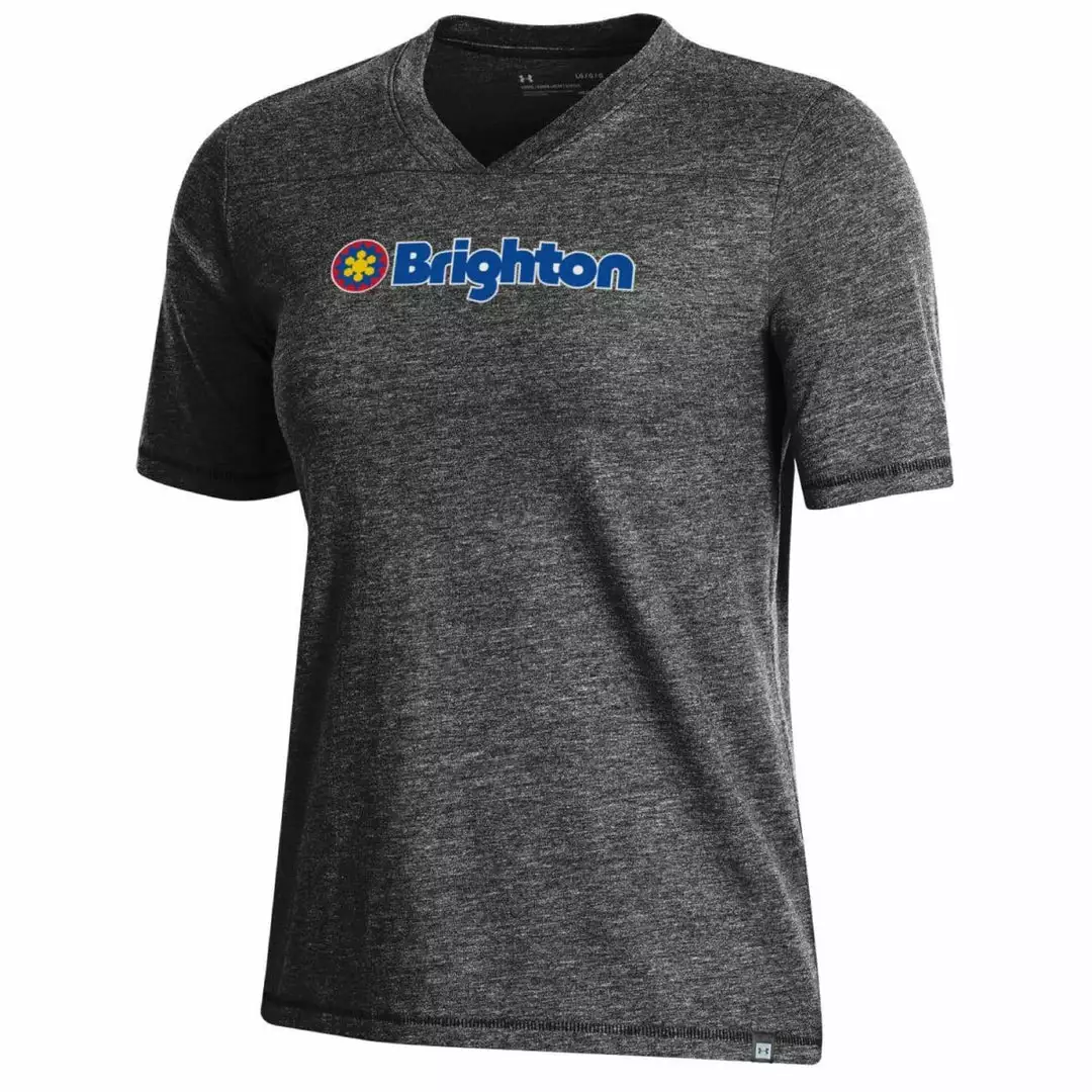 Experience superior power and durability in this soft, high quality V-neck Under Armour tee with a Brighton Mountain Resort logo from Brighton, Utah. Bi-blend fabrication is ultra-soft, light and has a natural heathered look. Loose fit has a generous cut that provides full range of motion. 65% cotton/35% polyester.Â