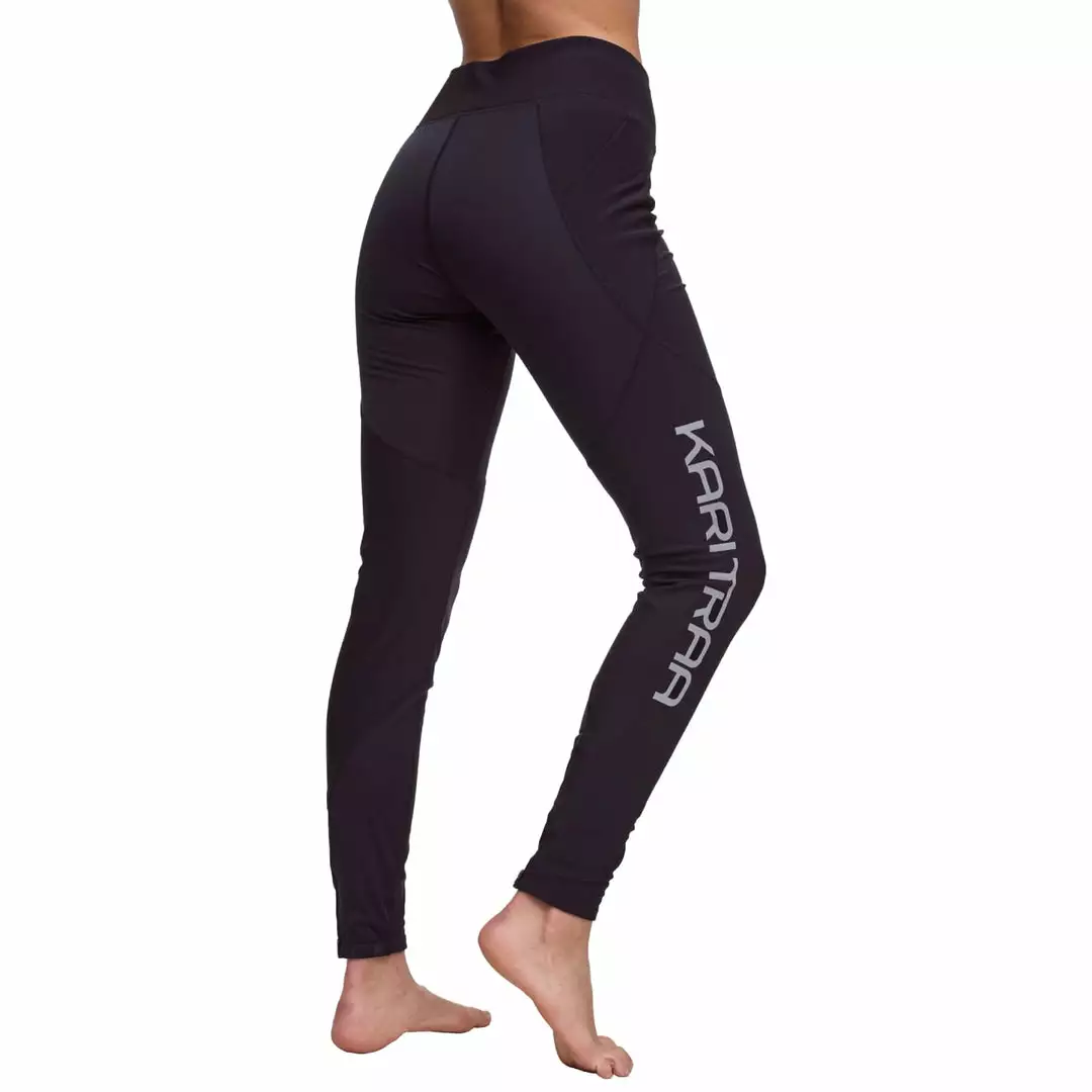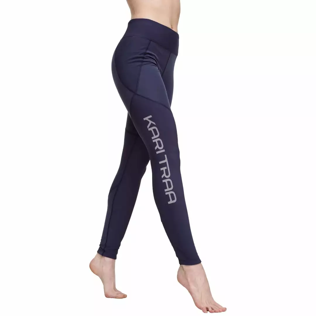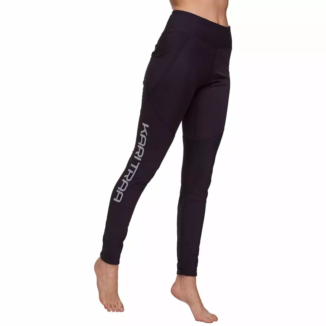 Kari Traa Tirill Tights are functional women’s training leggings. They’re warm and have water-repellent material on the front thigh to deal with winter weather. Silicone grip on the ankle holds the pant leg in place, while a crotch gusset and 4-way stretch properties won’t restrict how you move. The warm, quick-drying material is brushed inside with flatlock seams for non-chafing smoothness. So slip them on.